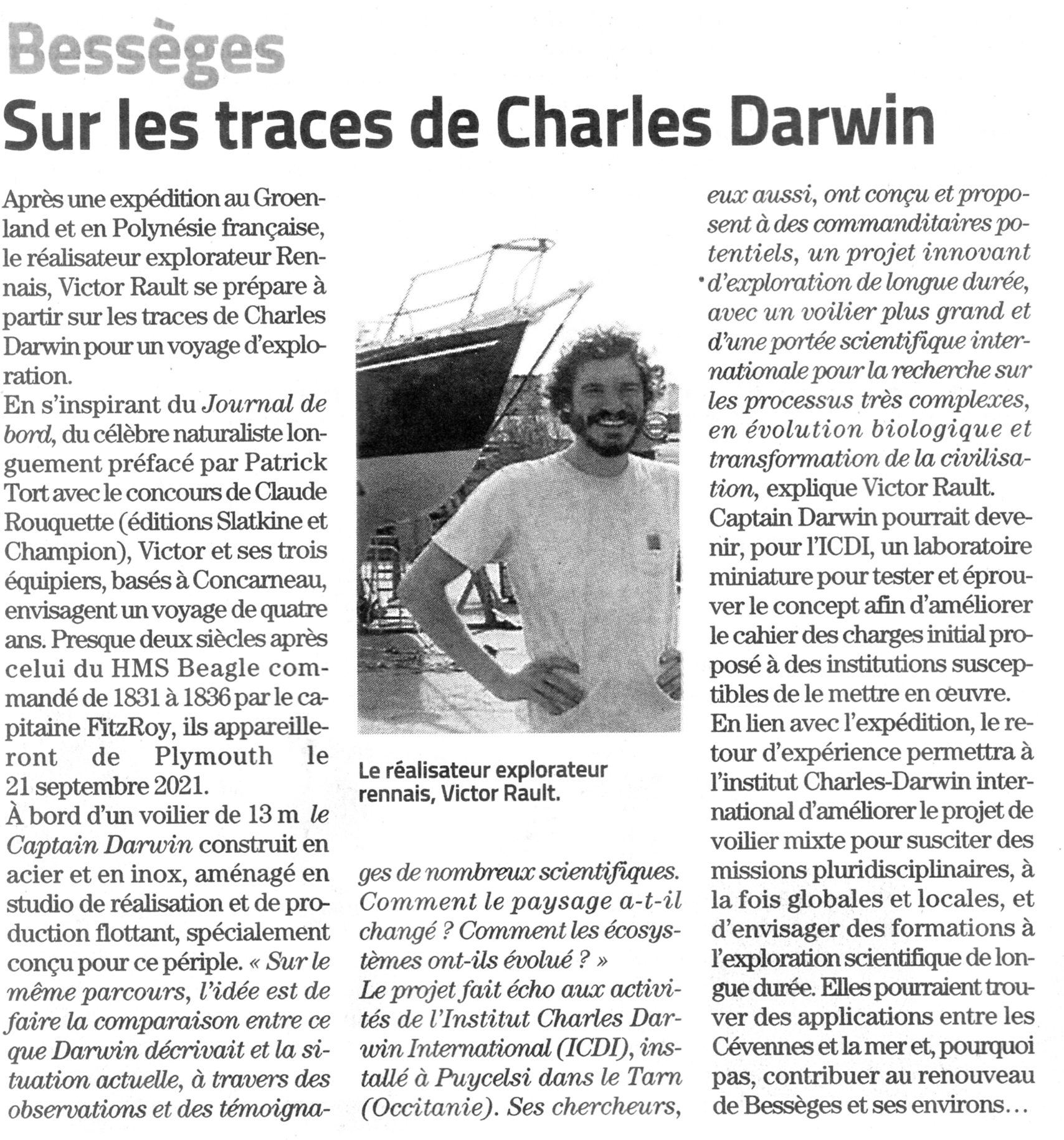 De passage à Bességes, le navigateur-réalisateur Victor Rault a rendu visite au naturaliste Claude Rouquette pour "Faire le point" avant son appareillage du port de Concarneau, à la fin du mois de Septembre. Il part sur son voilier "Captain Darwin" pour une exploration de longue durée sur les  traces de Charles Darwin en s'inspirant du "Journal de bord" du savant naturaliste, longuement préfacé par le professeur (h) Patrick Tort et Claude Rouquette (Édition Champion).