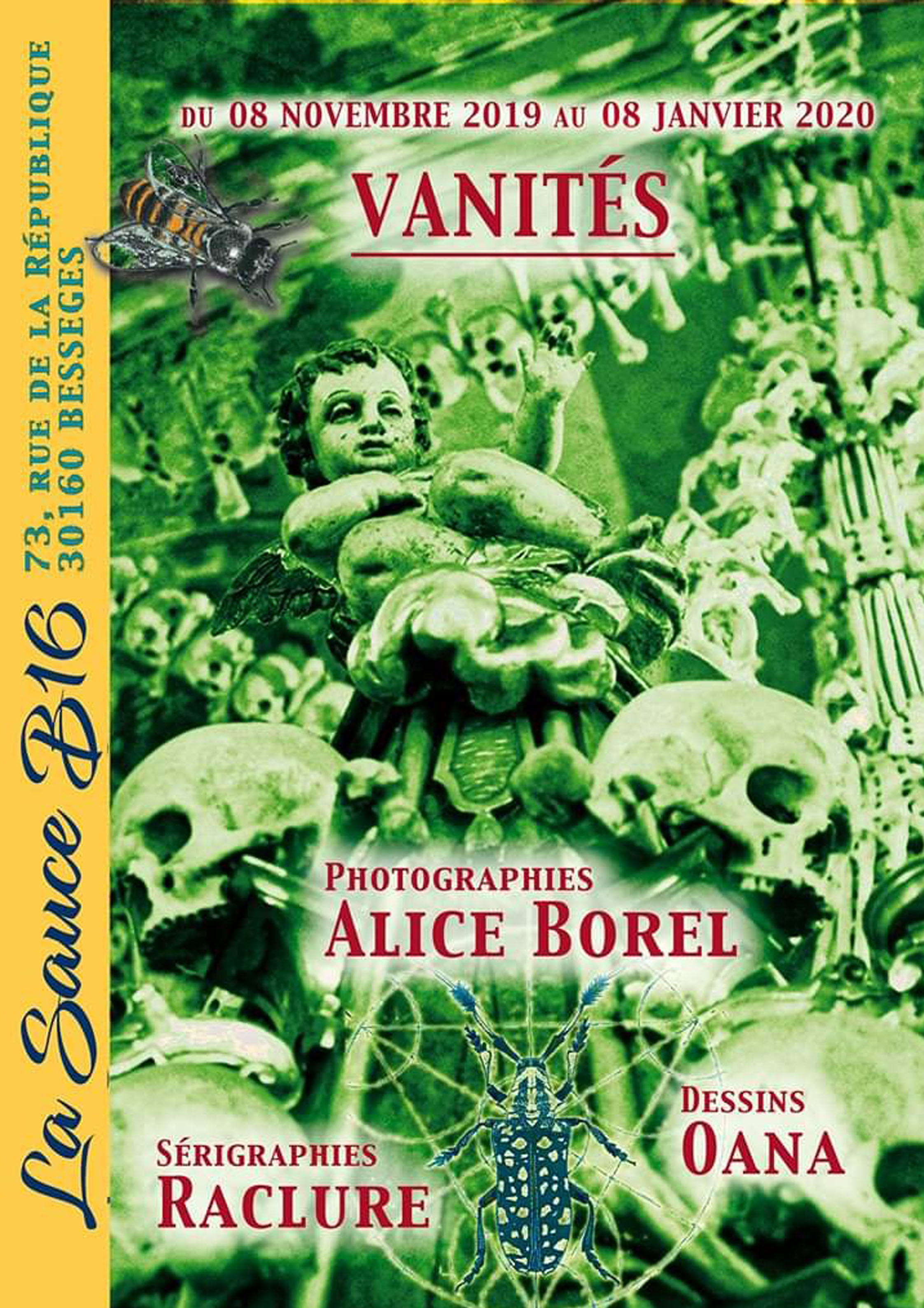 Photographies d'Alice BOREL, les Sérigraphies de RACLURE et les Dessins D'OANA.. L'exposition a pour thème les "VANITES".