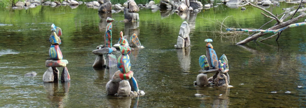 Imperturbable, Bruno continue d'empiler et de peindre des cailloux dans la rivière.