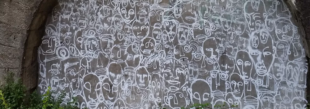 Des visages sur l'entrée de mine en face du pont de l'atelier
