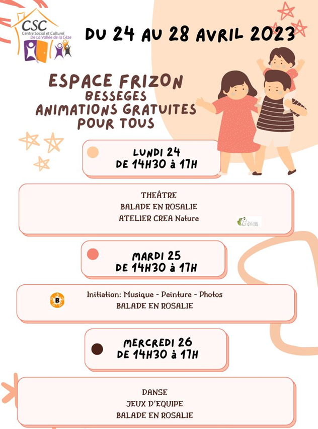 Contenu originel : Animations gratuites pour tous pendant les vacances d’avril Du 24 au 28 avril 2023, à l’espace Jacques Frizon – Foussignargues Organisé par le Centre Social et Culturel de la Vallée de la Cèze. Renseignements : 06 28 35 65 72 44.2836627, 4.1261281775606